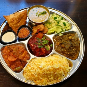 De Thali is de Indiase (zilverkleurige) schaal, waarop verschillende gerechten en andere culinaire heerlijkheden geserveerd worden.
